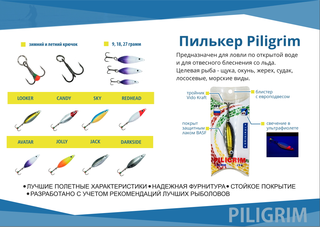 - Пилькер имеет смещенный центр тяжести. Смещение происходит в двух плоскостях. Это придает исключительные полетные характеристики и уникальную, стабильную игру на любых горизонтах проводки.